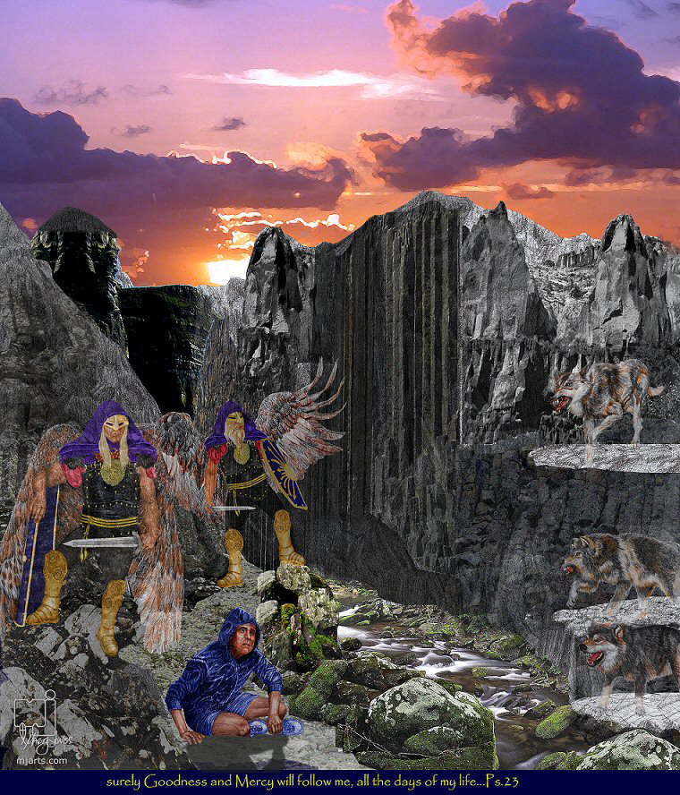 A friend of mine was describing the images that came to mind as he read the 23rd Psalm–“The Lord is my shepherd, I shall not want…surely Goodness and Mercy shall follow me all of the days of my life…” He described angels watching over him. This is the image that came to my mind, as he described his image.