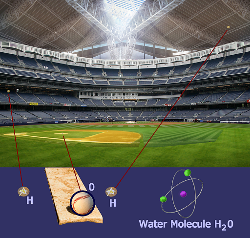 As I understand it, if an atom was the size of a baseball stadium, the nucleus would be the size of a baseball, and the electrons of a water molecule would orbit somewhere within the confines of the stadium structure. Quantum mechanics, and that concept which is sometimes, but not necessarily accurately called ‘Heisenberg’s Uncertainty Principle’, proposes that the act of looking for a particle actually changes the location of the particle—so I’ve indicated the Hydrogen atoms as amorphous ‘star’ like images. When you look to find them, they will most likely be somewhere else…
