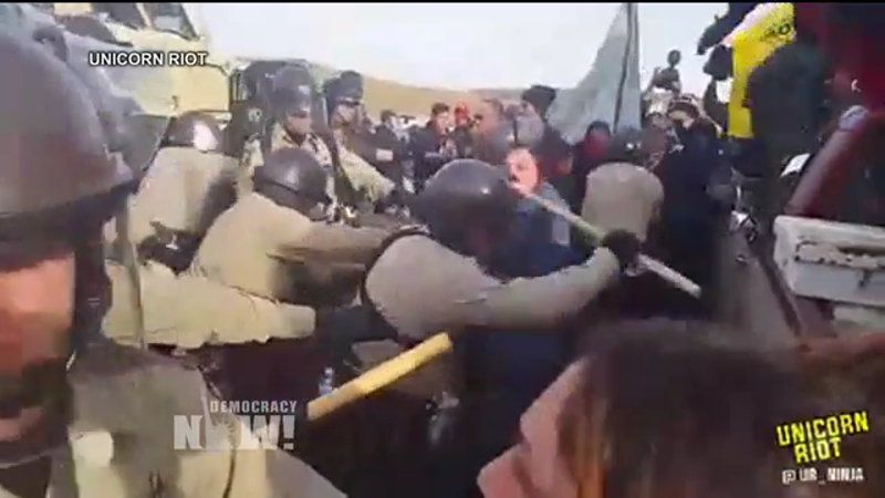 Unarmed protesters, on their own land, being attacked by police and National Guard members in riot gear, armed with rubber bullets, pepper spray, a sound cannon and police dogs. Forcing the unarmed protestors off their own land.