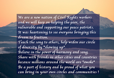 This last week, despite the snowstorm and ice that once again invaded Portland, I’ve joined Activists who protested when I was in college; and Activists who have found their voice in the years that I have missed… Including the son of one of my heroes, Peter Yarrow of Peter, Paul and Mary. I’ve followed Noel Paul’s career more closely and once wrote him in request that he sing “Wedding Song” at a friend’s wedding. Noel replied that he’d written the song for Peter and his wife; and that he had no plans for singing it at any other weddings. Christopher Yarrow was among the 60+ performers as this chorus was being videotaped yesterday; this video will be combined with the incredible vocal stylings of Marilyn T. Keller and several vocalists, singing a Darrell Grant’s new arrangement of the song originally penned by Naomi Little Bear Morena. This video will be published digitally, on the day before Inauguration Day. Tonight a repeat performance of Like a Mountain, with chorus members who assembled yesterday, will occur at Augustana Lutheran Church’s weekly Gospel/Jazz service.