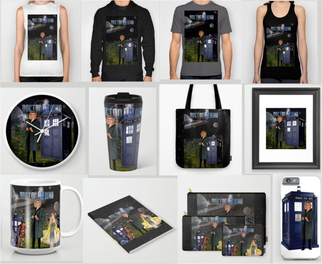 Two 13th Doctor images on a variety of Society6 products, delivered to your mailbox.