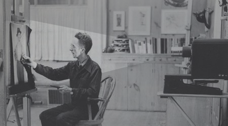 For what it’s worth, Norman Rockwell used a similar technique, using an opaque projector to project an image onto a canvas; which he then traced. Rockwell, however, hired models and a photographer. It’s possible that Johannes Vermeer used a similar technique with a camera obscura; many of Vermeer’s paintings have a photographic quality to them.