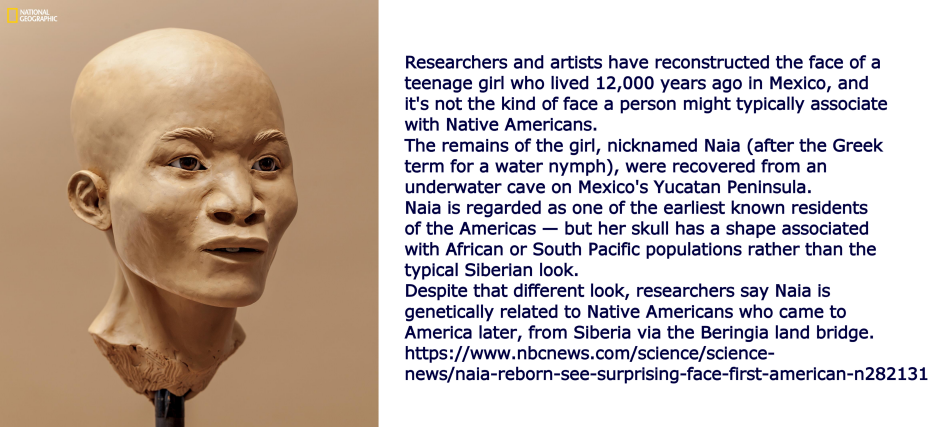 In this context, I have to explain what I mean: I believe that Ideas drive us further than simple Facts. “Naia” above, is a fact; her DNA consists of combined Asian and Siberian strains in a pattern that is not found west of the Alaskan longitude. Her DNA is consistent with all the Indigenous peoples that populate the Americas [some of this information comes from the study of a younger skeleton, a male child found in Montana, which did not have a representation of his face constructed]. The face above is not what most of us would call, ‘an American Indian’. Naia’s face is not our Idea of an American Indian. But “Naia” is a fact. It requires an Idea for us white folk to understand that all the Indigenous people, throughout the Americas, are Naia’s forebears’ descendants. One family. This Idea is shown, scientifically, to e a much earlier time.