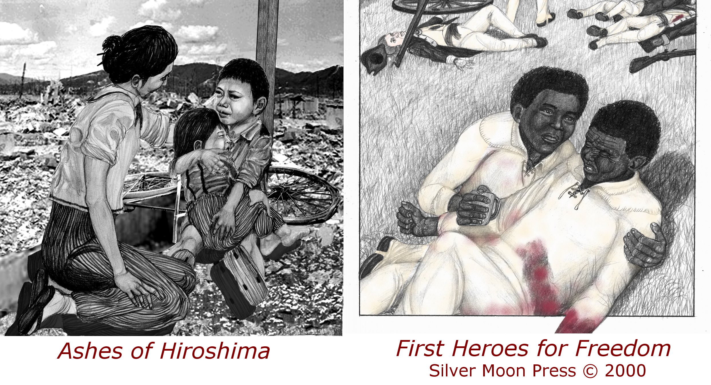 The Japanese boy in the image above is minutes away from dying from the radiation poisoning that killed his his sister. An illustration from a Hiroshima Diary—the encounter occurred. After the bomb destroyed Hiroshima, what was left were children wandering through the rubble, trying to find their parents, who had already been killed by falling construction debris or ‘shrapnel’; or simply had disintegrated. The teacher who wrote the Hiroshima Diary [a genre in Japan] was looking for her niece and nephew. She had been away from home when the bomb dropped; upon her arrival home, and learning about the missing children, she entered the blast range. She survived, and lived to an elderly age, scarred by radiation.