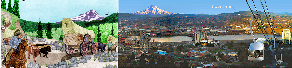 An image from my first colored children’s book, and an image for a client. Portland in the 1800s and Portland today.