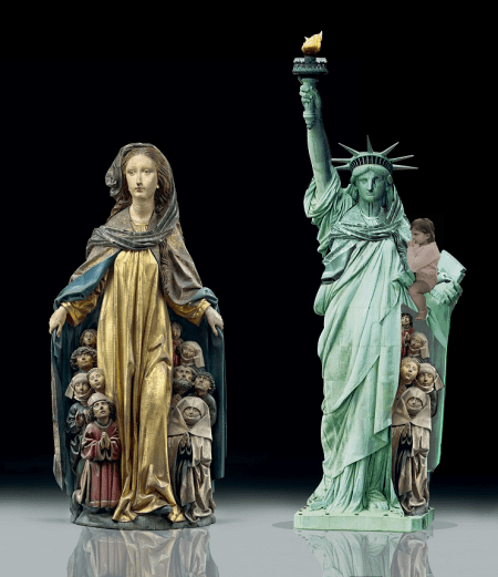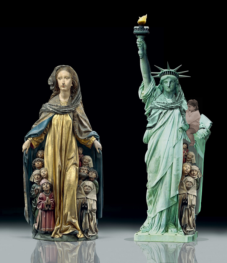 I have copied part of the Madonna’s cloak, and turned it coppery green for the Lady in the Harbor. There are additional cloak-parts underneath the girl in pink. The people under the Lady’s cloak are copied from both sides of the Madonna’s cloak.