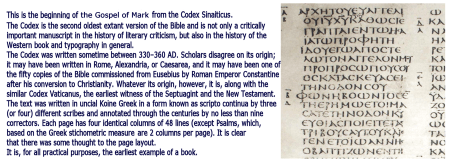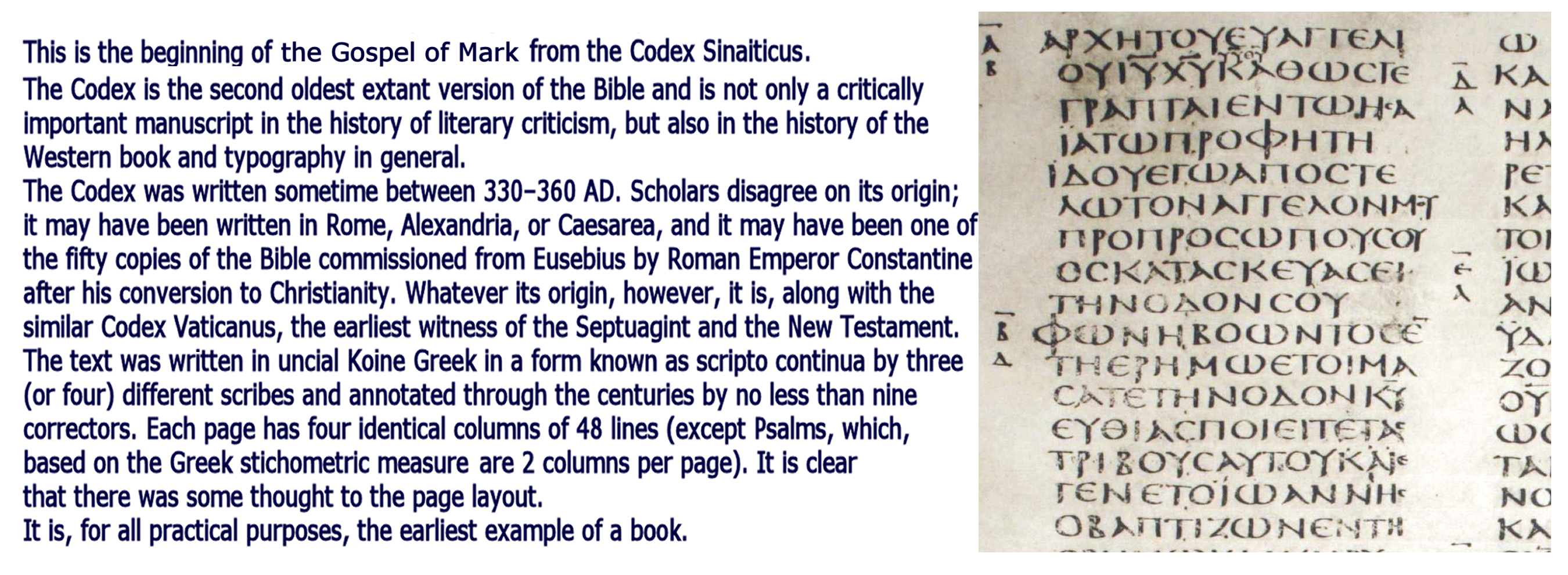 The Codex Sinaiticus, or Sinai Book, is an ancient fourth century C.E. Bible handwritten in the Greek language. The manuscript contains the Septuagint, a version of the Old Testament that was adopted by early Greek-speaking Christians, as well as the oldest complete copy of the New Testament. The book’s importance to biblical scholars is immeasurable. The pages are made of vellum parchment, or calfskin. The work is written in scriptio continua—without spaces between words. In the ancient Greek world, reading continuous text on a page was more like reading a musical score today. The reader would memorize the text and use the pages as a guide while reading aloud to an audience. Not until the 10th century C.E. would spaces between words become the norm [emphasis added].