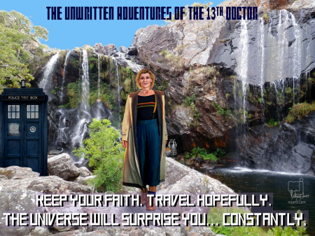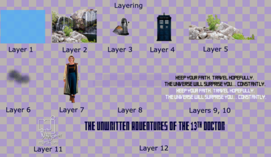 The components above are shown in back-to-front order; and are the layers of the resultant image. The final psd file has layers that are invisible/unused [two sets of fonts I decided not to use]. The original psd file had several additional layers that were merged-down to the layer below. The rocks of Layer 2 were composed from 3-5 merged layers. The TARDIS [Layer 4] and the Dalek [Layer 3] are sandwiched between Layer 2 and Layer 5.