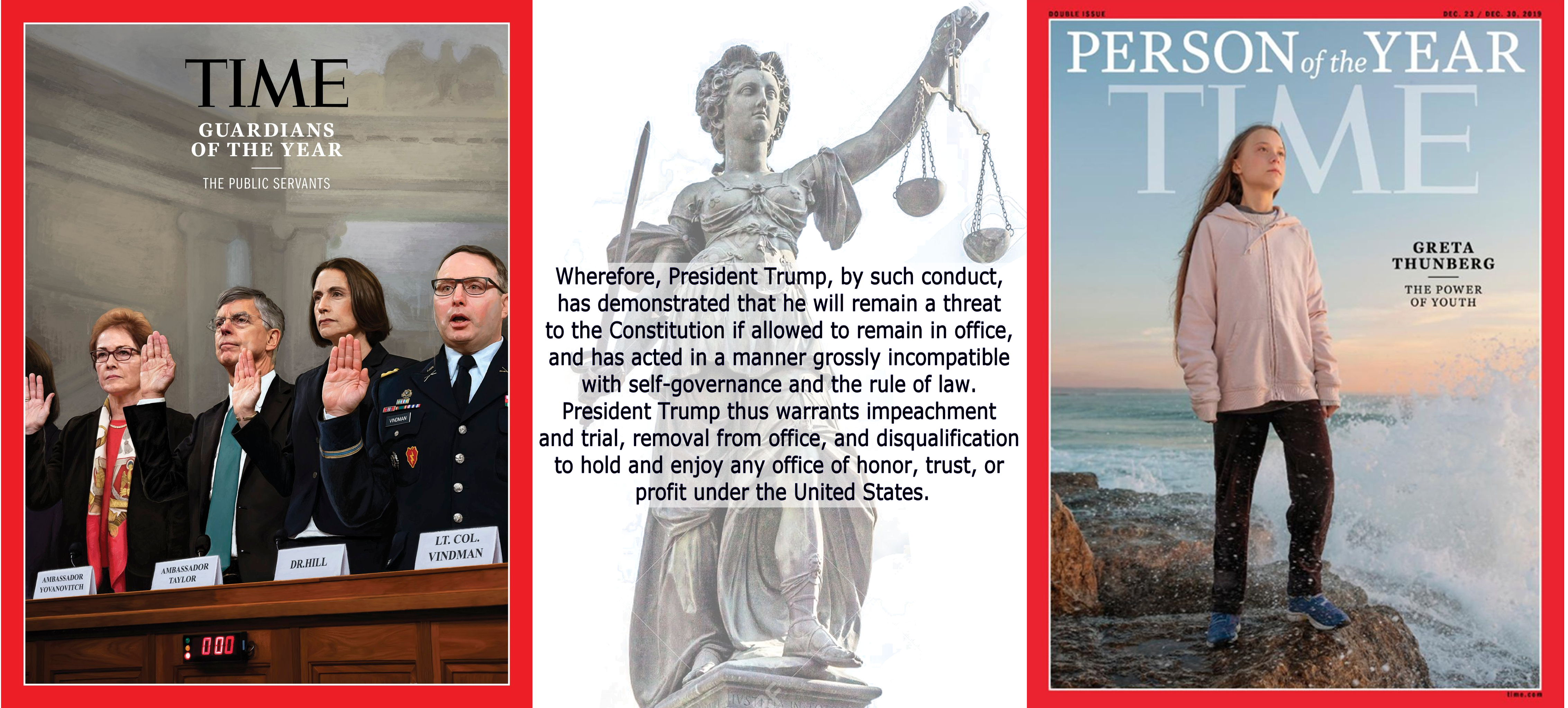 On the right side of the pages is Greta Thunberg, the teenaged Climate Change Activist who has sailed the Atlantic Ocean, by herself, twice. She has become an icon for people across the world, who are under the age of 40. A symbol that is being ignored by our present Administration, who has a bizarre investment in the complete ignorance of factual evidence regarding Climate Change. Ms. Thunberg has been declared by Time Magazine as Person of the Year. She was also expected to be awarded the Nobel Peace Prize.