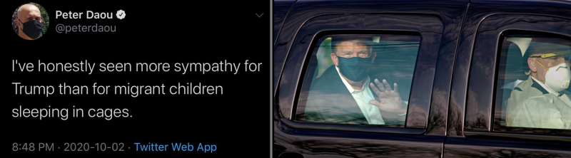 The Virus Trump has been ridiculing for months; to the point where Trump supporters today still refuse to wear masks; even though their Leader is infected. No one knows exactly how bad the President’s infection is, because ‘the White House’ by choice, cannot be trusted to tell the Truth. The SUV in which the President, against doctor’s orders, decided to take for a drive to New Jersey is hermetically sealed to protect against gas attacks. It is air-tight. The Secret Service agent in front of the President, as well as any other individuals in the SUV are breathing the air in the President’s lungs and are probably infected with COVID-19. It is unlikely that they will be treated with the experimental drugs and steroids being used on the President.