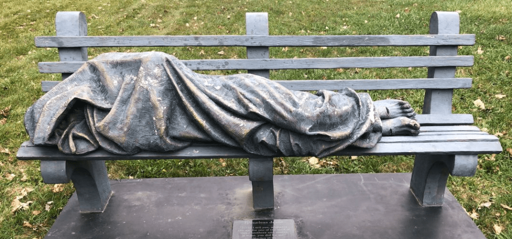 “The statue depicts Jesus as a vagrant sleeping on a park bench. St. Alban’s Episcopal Church installed the homeless Jesus statue on its property in the middle of an upscale neighborhood filled with well-kept townhomes.
