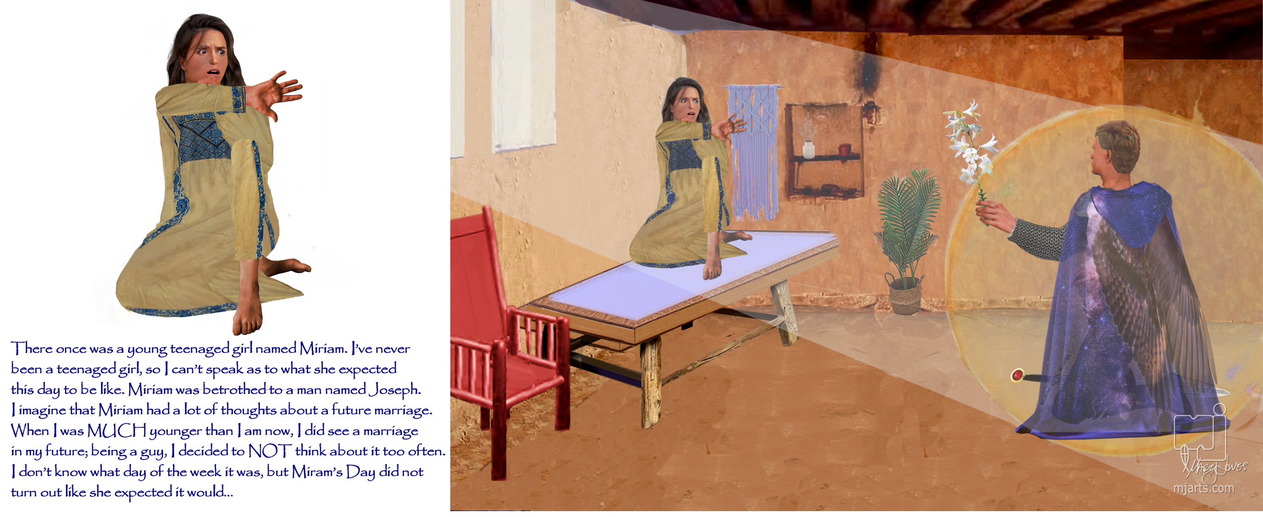 Back to Mary. She was visited by an Angel and was told that she would that she would bear a son who was to be named Yeshua; and that he would save the people from their sins. There is a long passage in the New Testament called “The Magnificat”—Mary’s response to the Angel that came and told her she would bear a child, not having ever having sex. A month or so ago, I created the image below, thinking about how my 19-year-old grand-daughter might act, if she was in Mary’s situation.