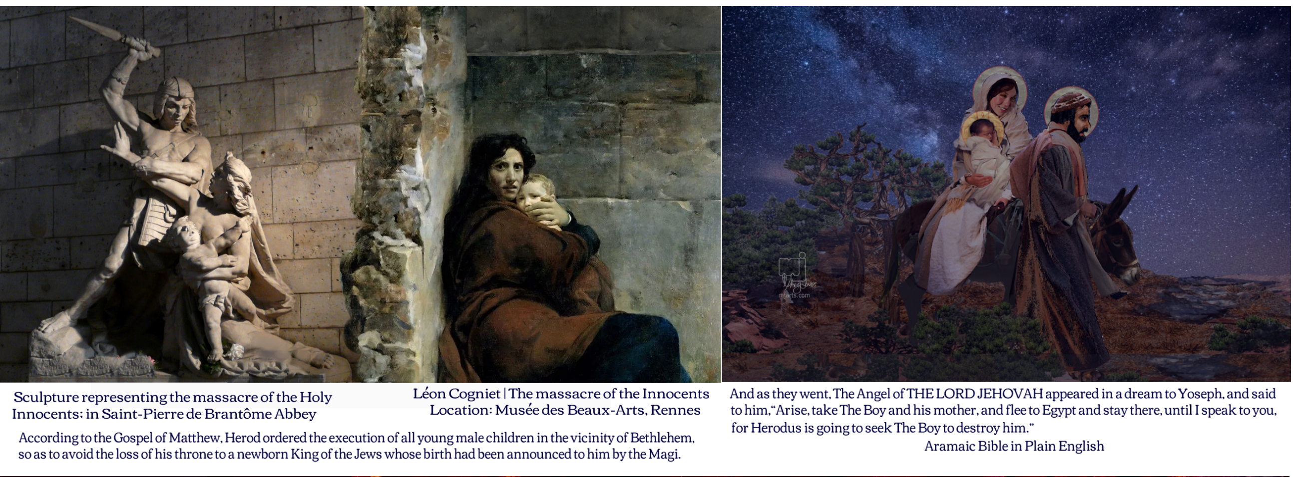 Herod, realizing he had been fooled by the Magi, ordered that all male children of 2 years of age and younger were to be murdered. History calls this The Massacre of the Innocents [above left]. Such massacres have continued into our time. Humans are broken. An Angel warns Mary’s husband Joseph in a dream and tells Joseph to take his young family to Egypt [above right].