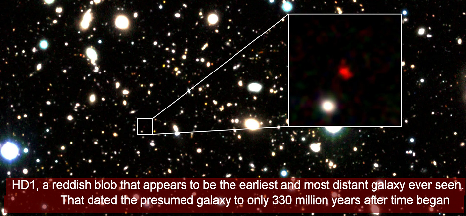 The Universe had a beginning. “330 million years after time began,” in astronomical terms, is fairly short. Shortly after HD1 was discovered, another signal from about the same distance was discovered; astronomers have no idea what the newer discovery is.