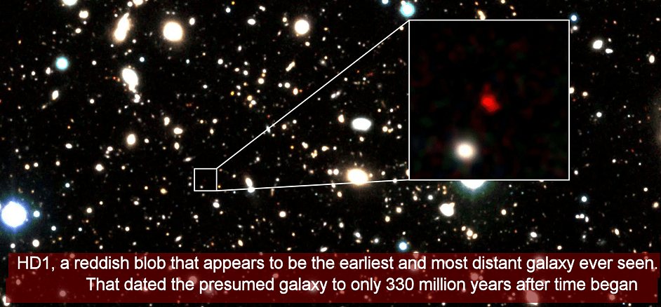 The Universe had a beginning. “330 million years after time began,” in astronomical terms, is fairly short. Shortly after HD1 was discovered, another signal from about the same distance was discovered; astronomers have no idea what the newer discovery is.