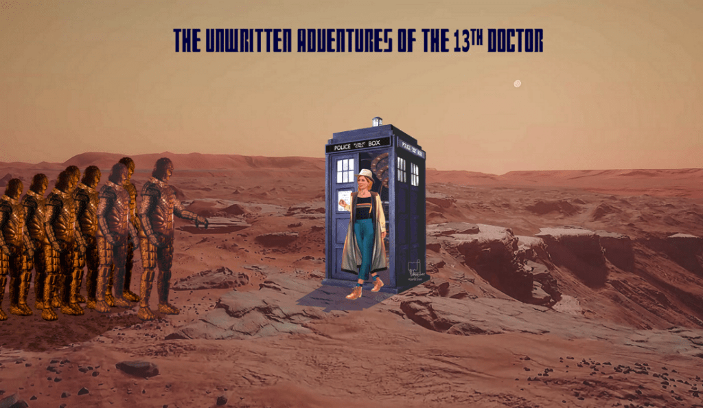 When I was young and checking out science fiction from the Multnomah County Library, I never imagined that I would have the privilege of seeing the surface of Mars. The image above is the actual Martian surface [scale may be wrong] with added Martian Soldiers and the 13th Doctor.