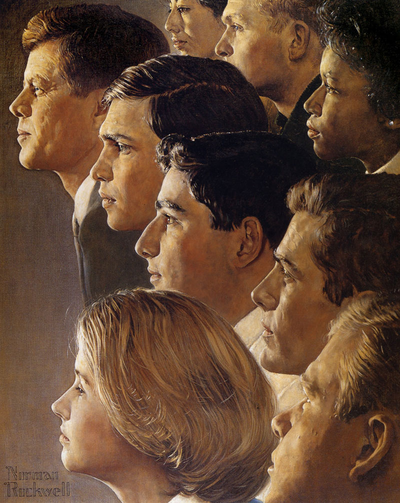 Story illustration for Look, June 14, 1966. Rockwell repeated the simple and powerful style used in Freedom of Worship to commemorate the fifth anniversary of the Corps. During his 1960 presidential campaign, John F. Kennedy proposed the idea of a volunteer organization of trained people who would be sent to developing nations in Africa and Asia to assist villagers in educational and agricultural projects. In 1961, the program, which Kennedy hoped would promote understanding between nations, was officially instated.