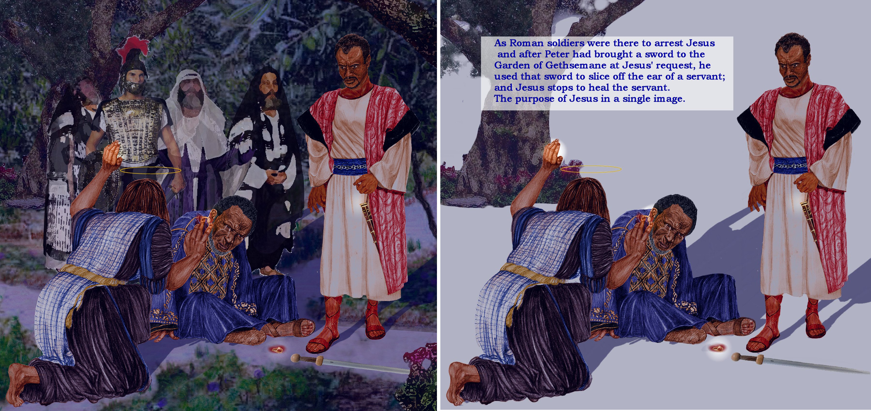 As Roman soldiers were there to arrest Jesus and after Peter had brought a sword to the Garden of Gethsemane at Jesus’ request, he used that sword to slice off the ear of a servant and Jesus stops to heal the servant. The purpose of Jesus in a single image.
